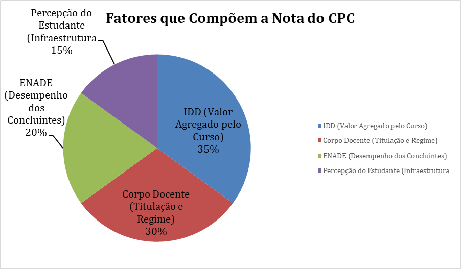Como o gráfico demonstra, o valor que o curso agrega ao aluno (IDD) e a qualidade do corpo docente são os fatores de maior peso, somando 65% da nota.